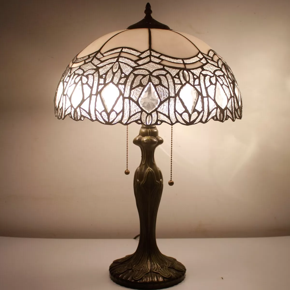 Tiffany Style Table Lamp Stained Glass White Crystal Shade Metal Base 24"Tall Antique Large Luxurious Bedside Desk Reading Light Fleur De Lis Living Memory Lamps Sympathy Living Room Bedroom Bar Banker Library