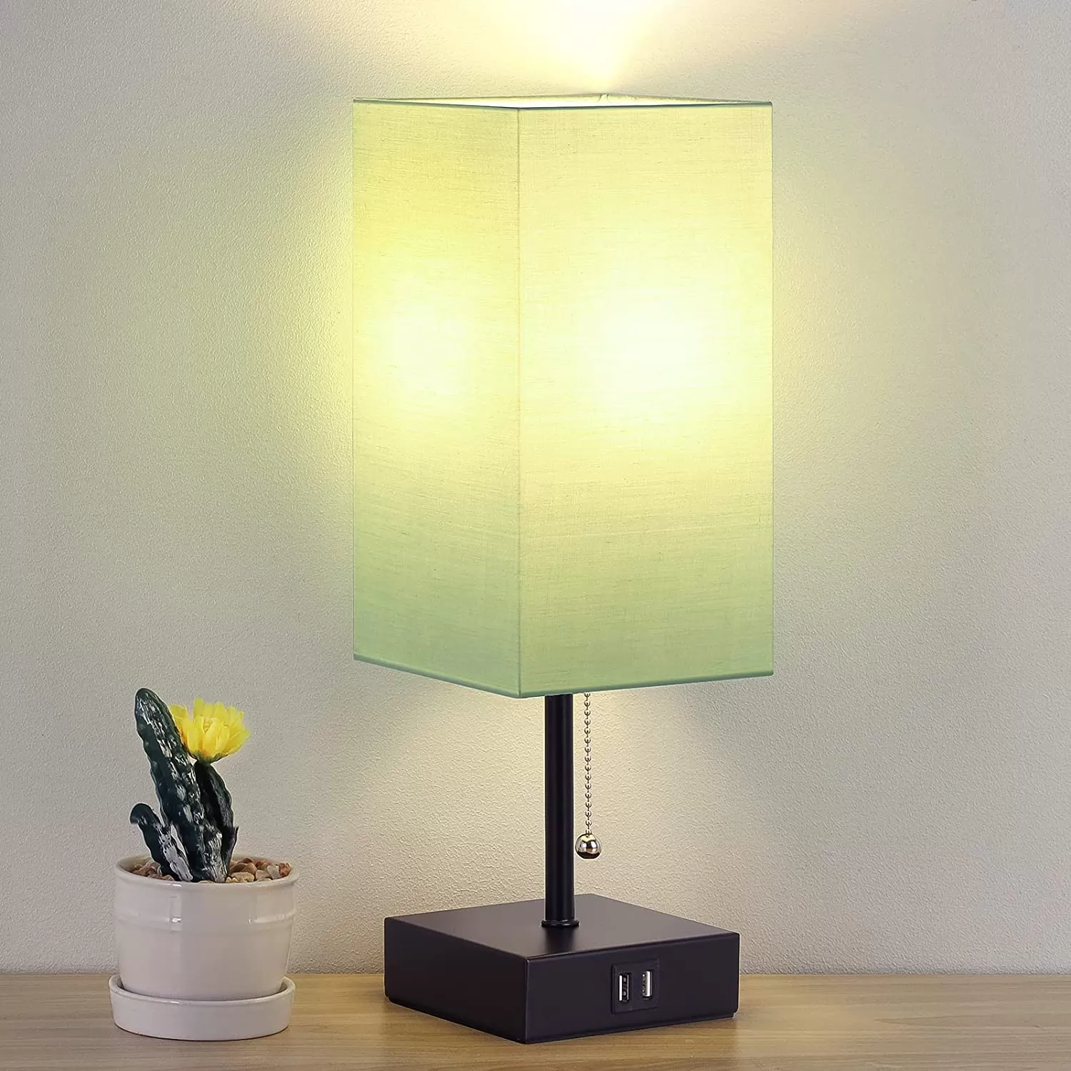 GGOYING Bedside Table Lamp, Pull Chain Table Lamp with Dual USB Charging Ports, 2700K LED Bulb, Fabric Linen Lampshade, Nightstand Lamp for Livingroom Bedroom Office Reading Working